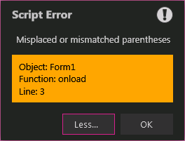 By default Script errors, such as syntax errors, which arise at runtime will display an error message box which provides information about the type of error, the Script which was running when the error occurred and the line number within the Script at which the error occurred. When the user clicks the OK button to dismiss the message box, the Script is terminated and control returns to the app.