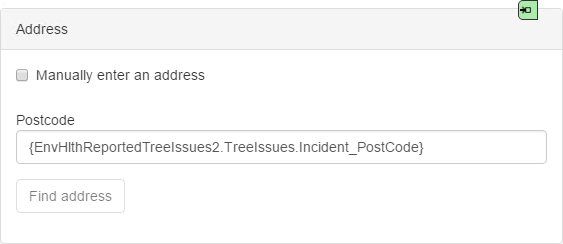 If you specify an input mapping for any fields within the Element, the appropriate mapping will be displayed in each field within the Form Design workspace, in the format {<datasource>.<dataset>.<dataitem>}. For example, the following Address Finder has an input mapping for the postcode field: