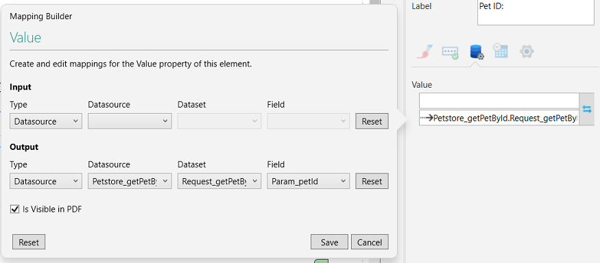 Next, with the text box selected, click the Data tab within the Properties pane. Click the Mappings button, , to the right of the Value box. Within the Mapping Builder dialog box's Output property, from within the Datasource drop-down, select Petstore_getPetById. From within the Dataset drop-down, select Request_getPetById. From within the Field drop-down, select Param_petId: