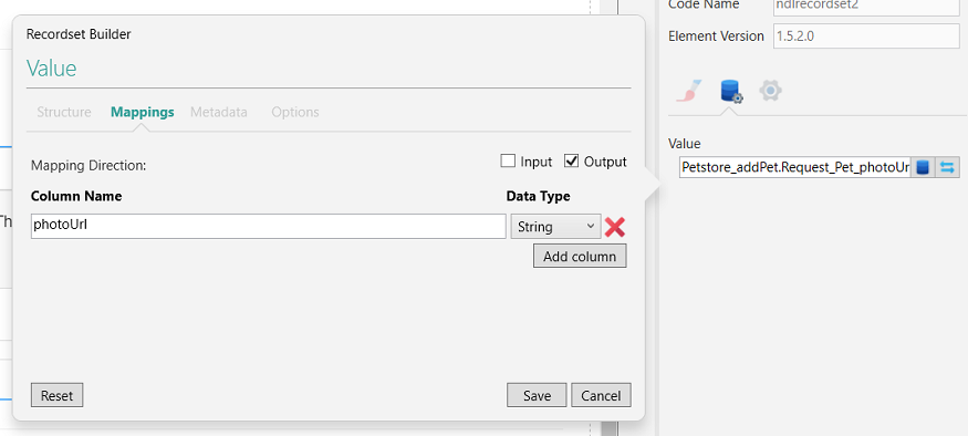 With the Recordset selected, within the Properties pane, click on the Data tab. Click the Value button to reveal the Recordset Builder dialog box. Beneath the Map to an existing datasource heading, select Petstore_addPet from within the Datasource drop-down. From within the Dataset drop-down, select Request_Pet_photoUrls. Press the Save button immediately beneath the Dataset drop-down, and when the Mappings tab opens, de-select the Input option, then click the red crosses next to each of the listed columns to also de-select them, apart from photoUrl: